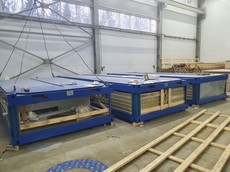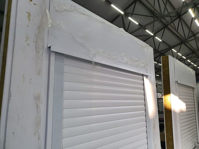 Блок-контейнеры "КАСКАД". Набор мобильных модулей изготавливался для самостоятельной сборки Заказчиком. Место поставки: Азов. Особенности. Для данной поставки нами был разработан способ монтажа рулонных ставень в трехслойную сэндвич-панель. Так называемые интегрированные роль-ставни.Мобильные модули в транспортной форме TransPack